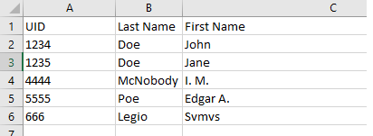 Purpose: This feature allows an external data file containing students (or customers) to be saved to the database. The data file MUST HAVE A HEADER ROW, with column headings “UID”, “Last Name” and “First Name”.