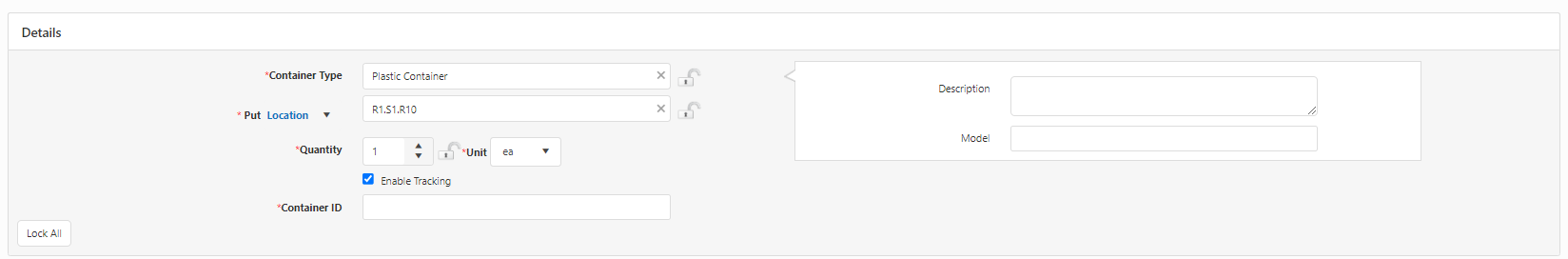 - Description and Model - This information will automatically populate when you select the container type and is read-only.