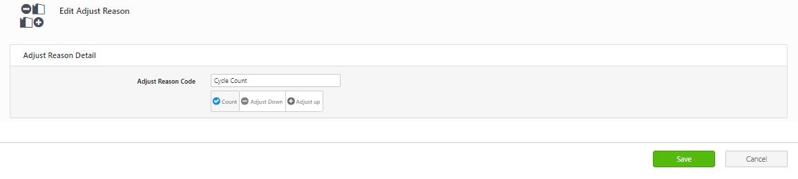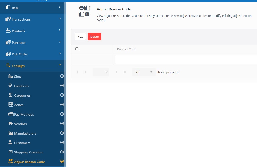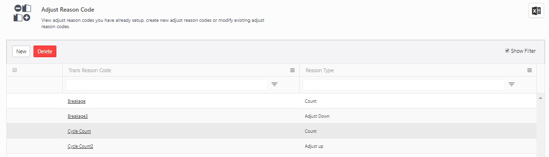 - New - Click on the new button to add a new reason code. Refer to the topic Add Adjust Reason Code or New Adjust Reason Code.