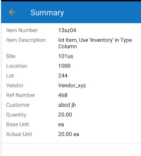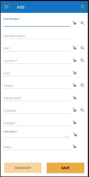 - Fields with an asterisk (*) are mandatory. Also, you can lock the field, refer to Android Pinning Data. The magnifying glass icon allows you to search for an item. It will navigate to the Search Items screen where you can search for items.