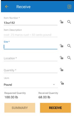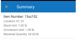 - After tapping on Receive, a number will appear on the Summary button, representing the total number of received transactions you've completed. You can continue adding inventory to different items as needed.