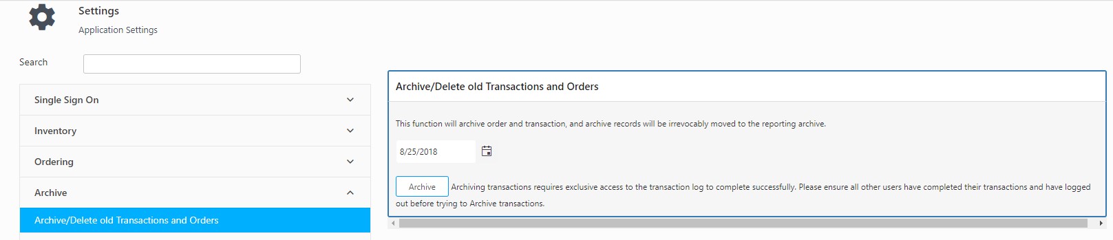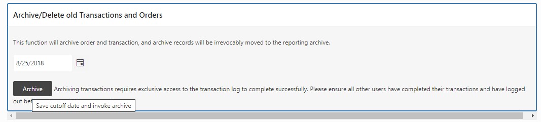 - Enter the cut-off date and click on the Archive button to initiate archive transactions and orders.