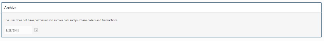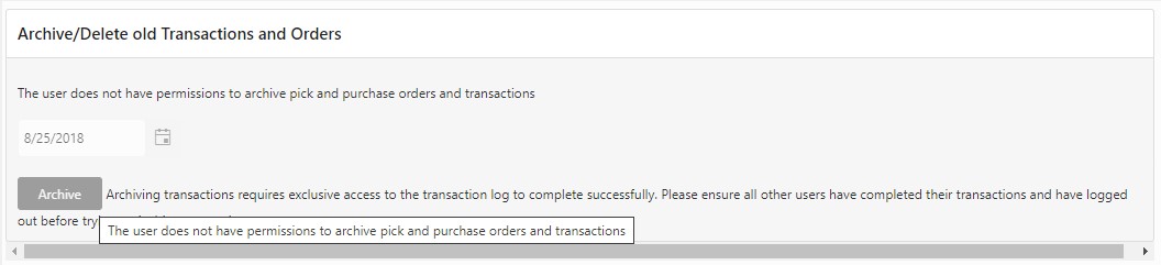 - If the user or role possesses the following permissions: "Archive Transactions" with both "Allow Access" and "Edit" privileges, as well as "Transaction History" with both "Allow Access" and "Delete" privileges, they will have the ability to archive pick orders, purchase orders, and transactions.
