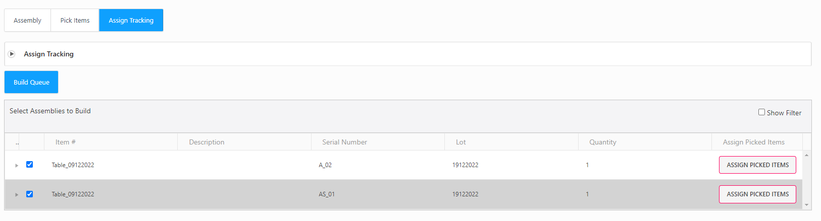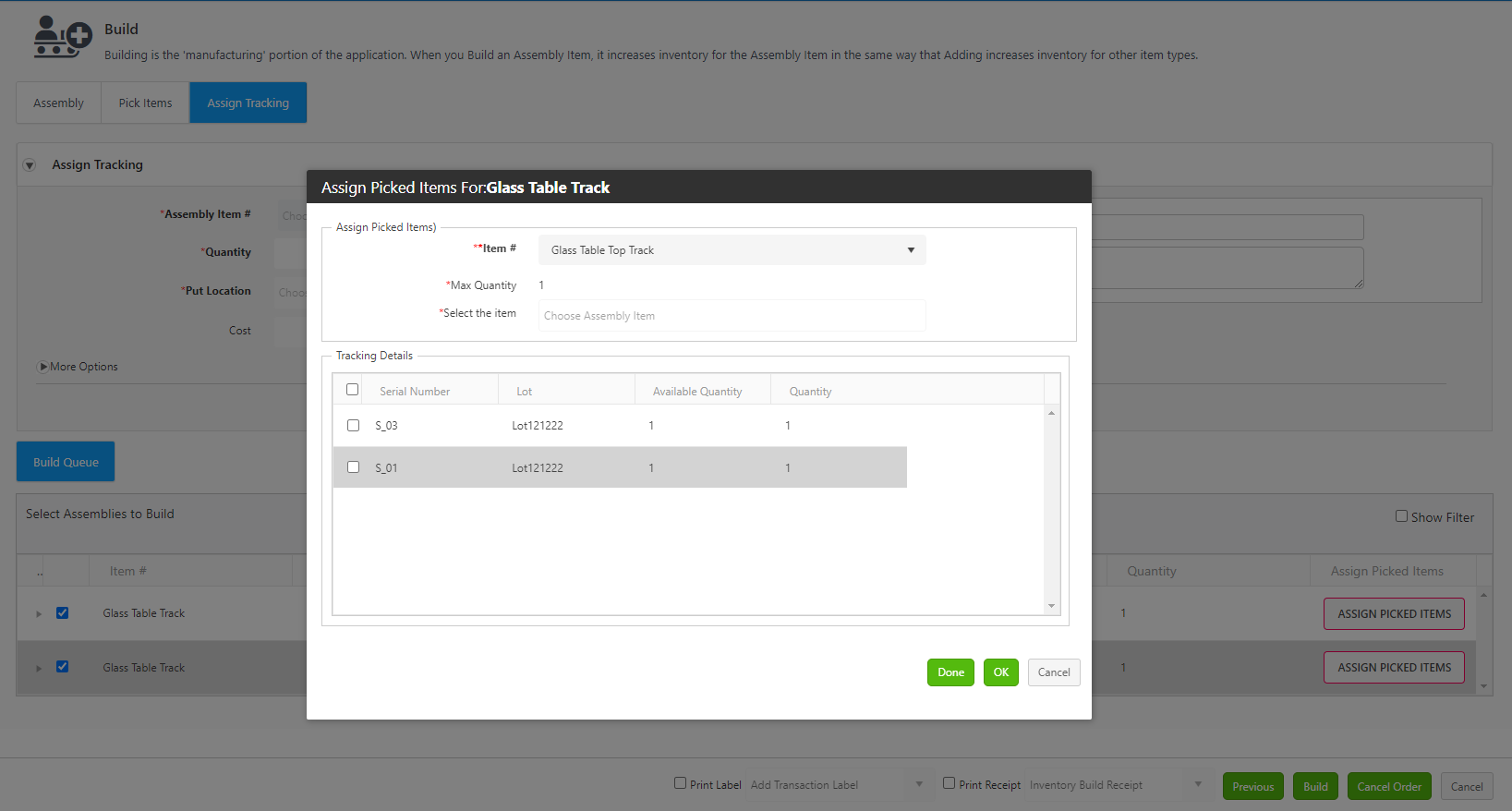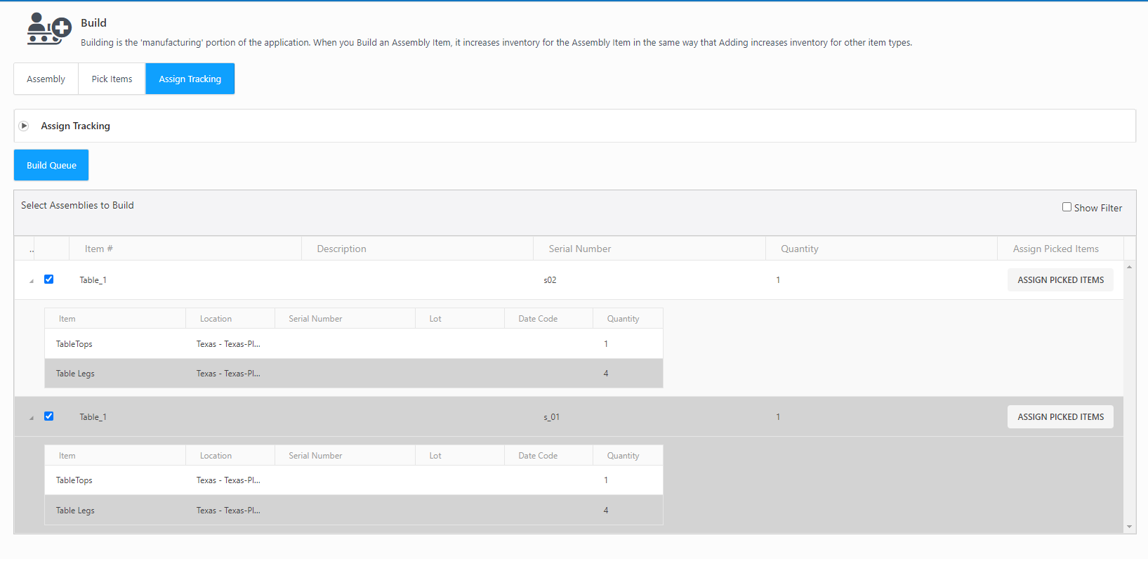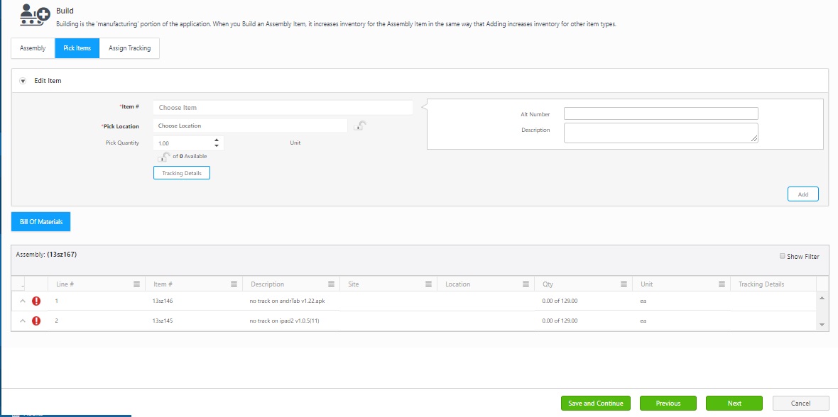 - Assign Picked Items button will appear if you are building more than one assembly and if the assembly and/or BOM have trackbys. You should Assign Picked Items for the assembly that you are building.