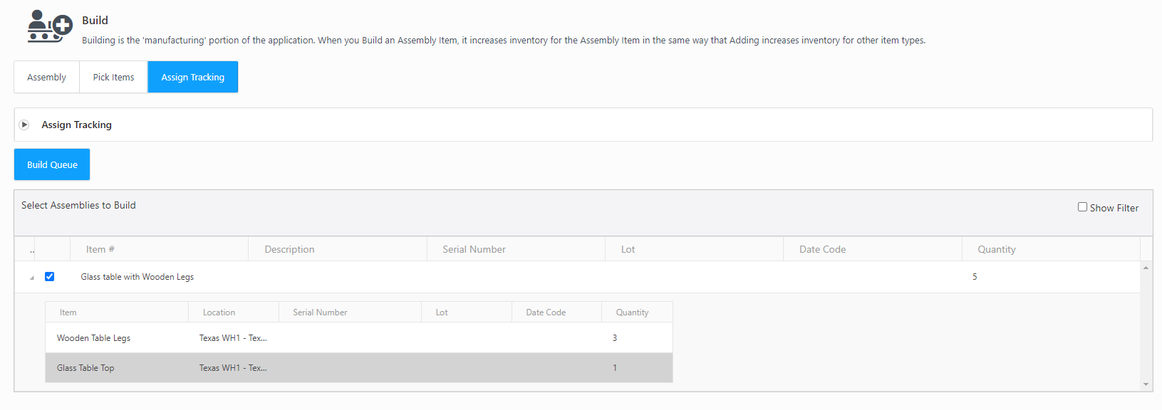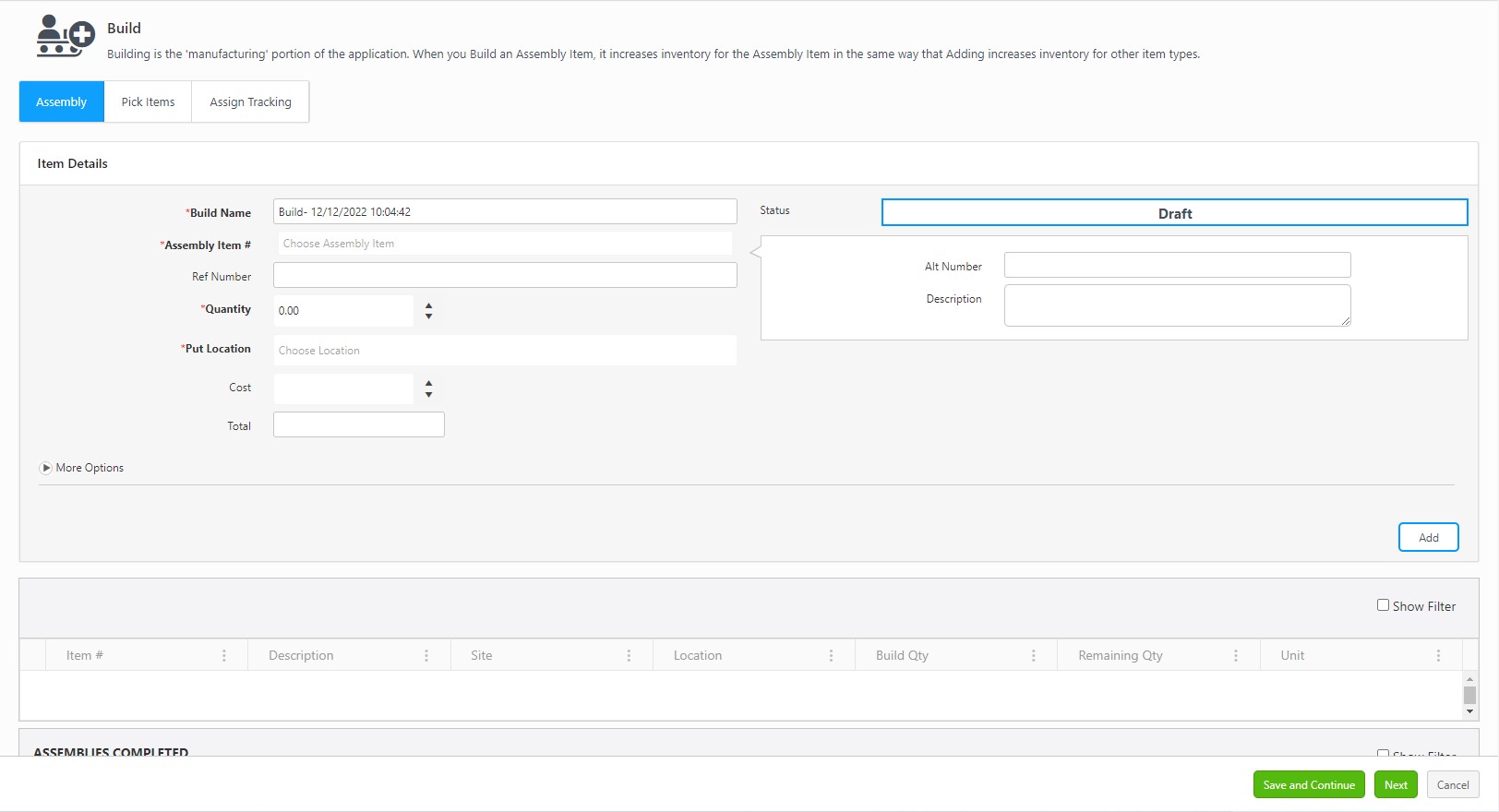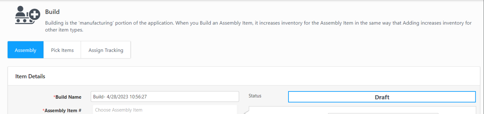 - Build Screen has three tabs - Assembly, Pick Items, and Assign Tracking.