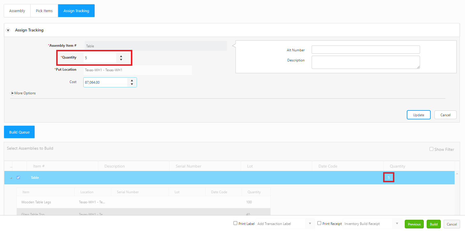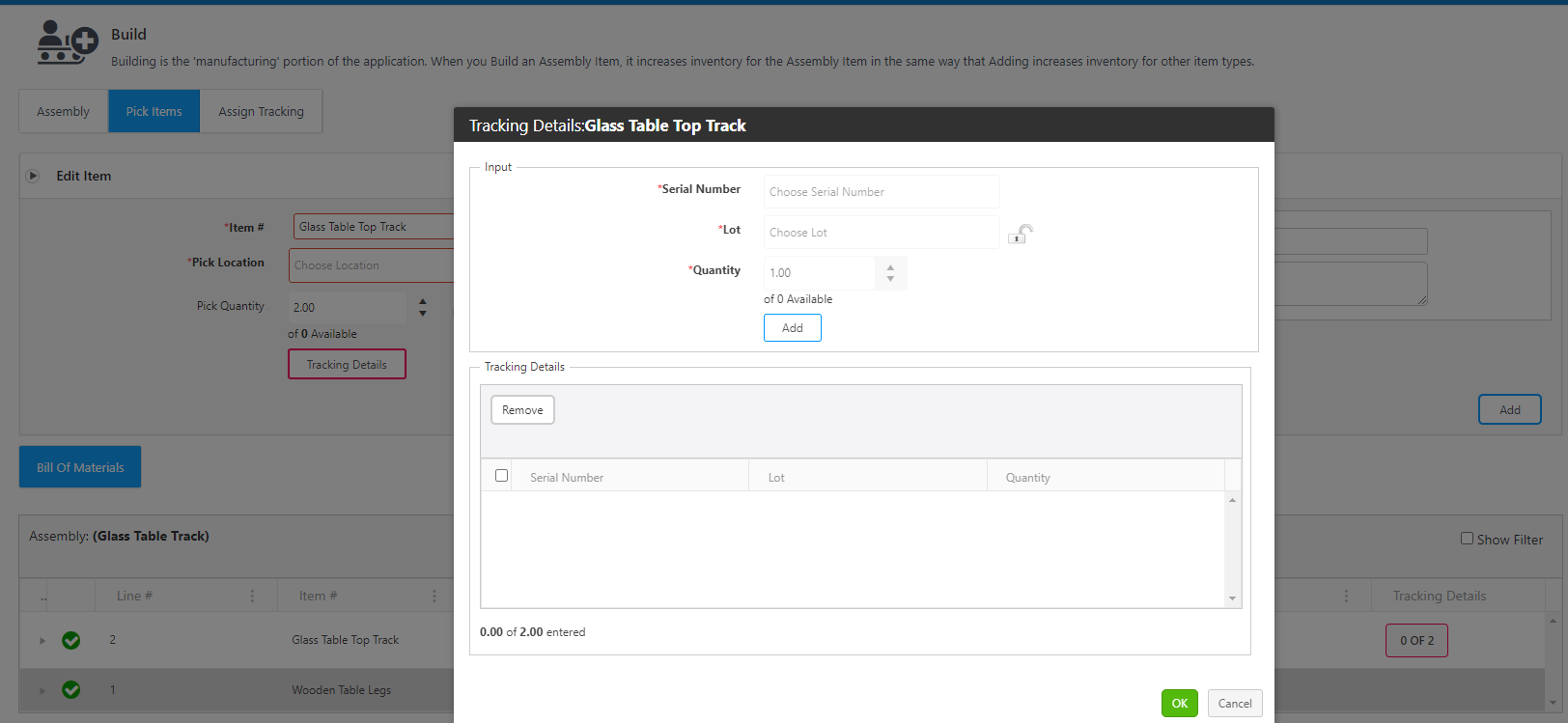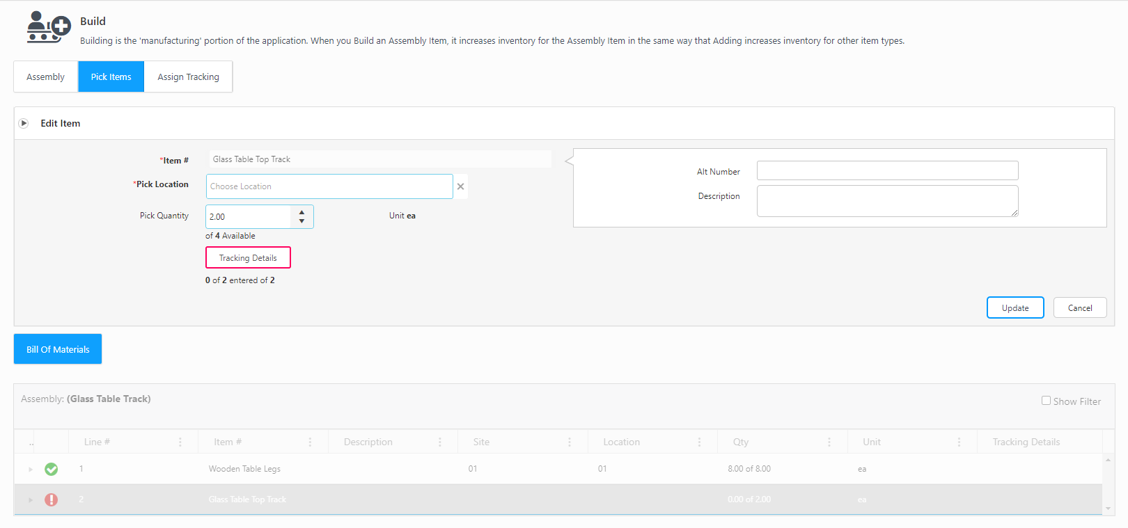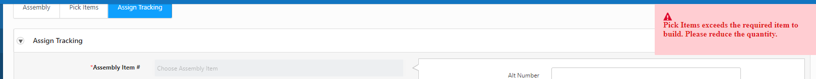 Note: Any quantity updates done on the Assign Tracking tab will not change the Assembly quantity in the Assembly tab or the Pick Quantity entered on the Pick Items tab.