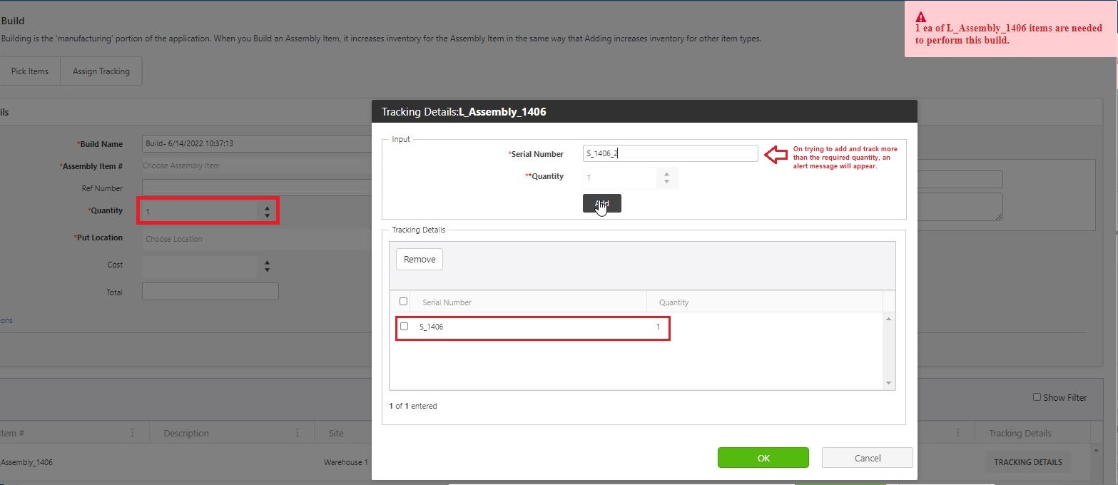 - The Tracking Details button will appear if the Assembly has any Track Bys. On trying to add and track more than the required quantity, an alert message will appear to the user that the number of trackbys entered for the Item number does not match the necessary amount, i.e., NN BaseUnit of ItemNumber items are needed to perform this build. Refer to Tracking Details.