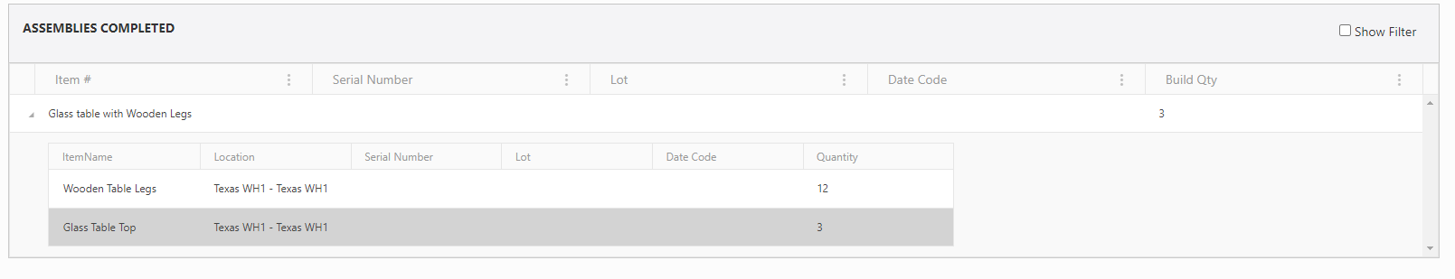 - Completed Build Assemblies details will appear on the Assembly Tab below the Assemblies Completed grid.