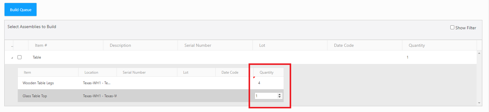 - Select Assemblies to Build - Click over the quantity below the Quantity Column and update the count.