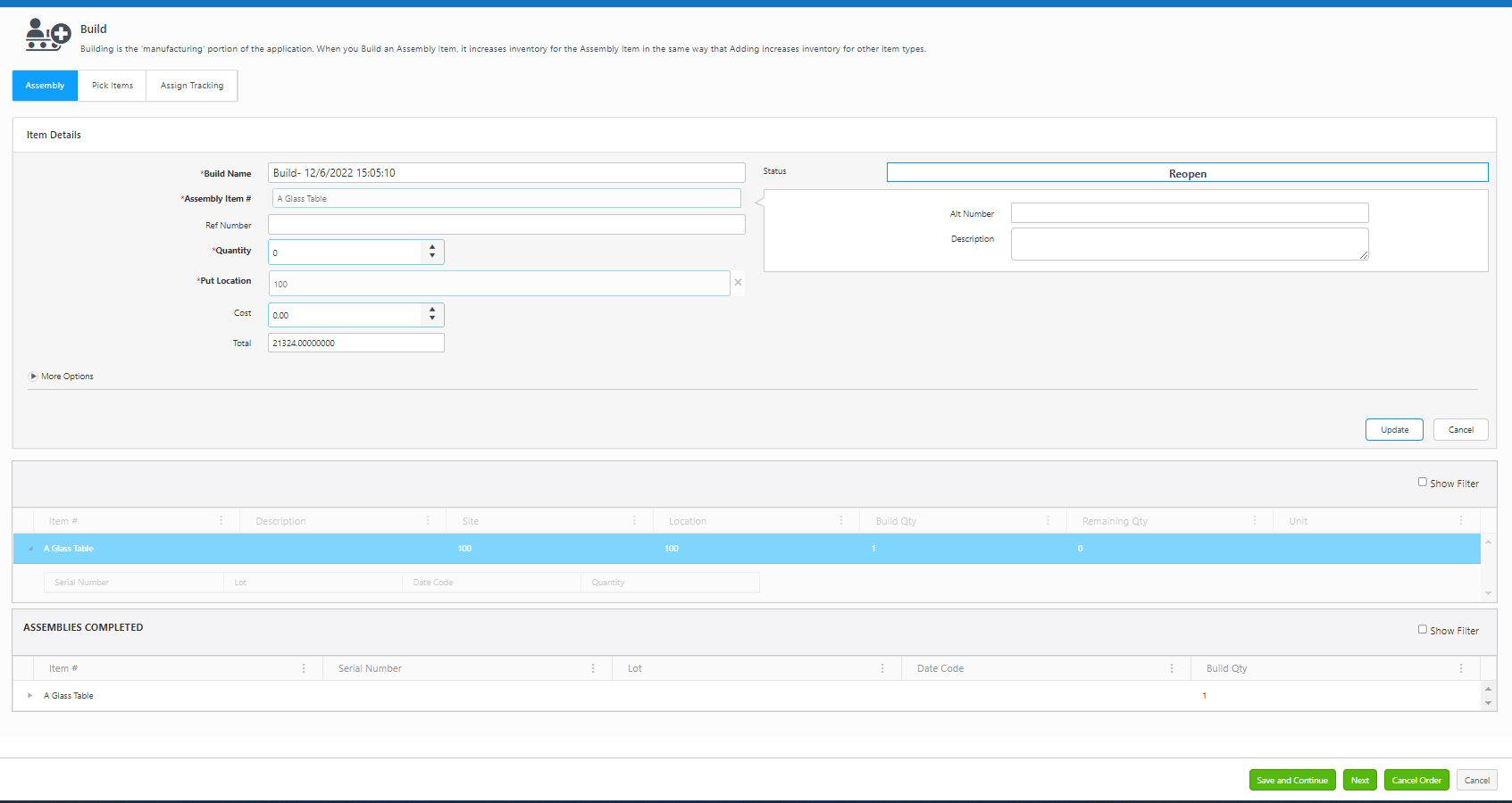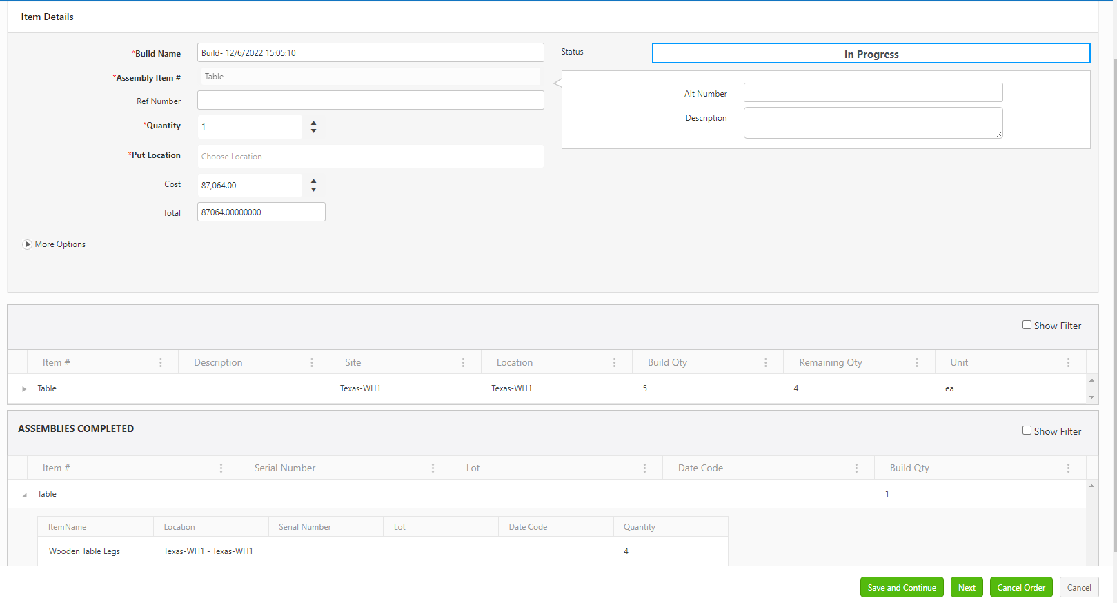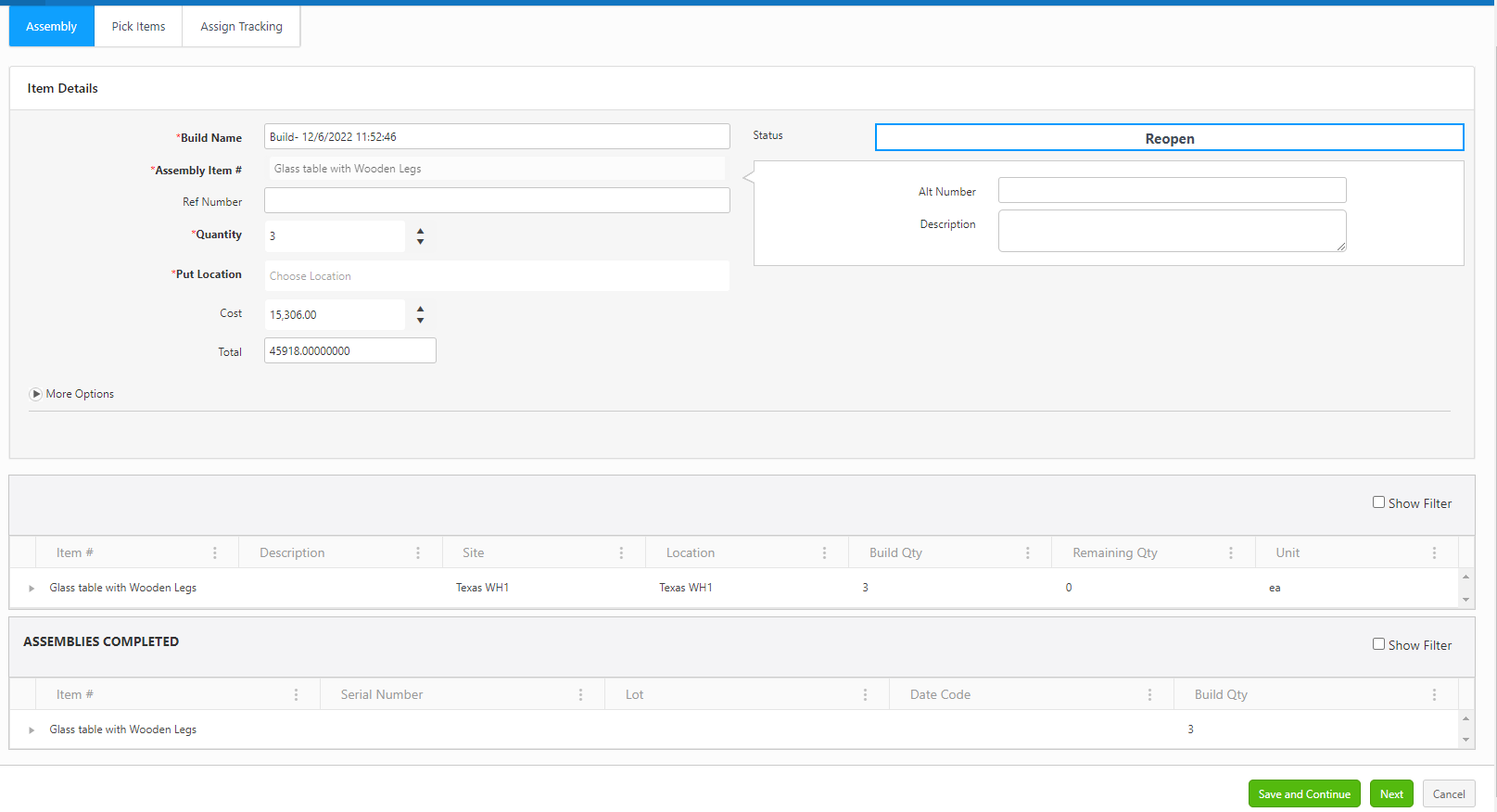 - You can click on the Save and Continue button at this stage and come back later or proceed by clicking on the Next or Pick Items tab. The Status will remain in "Open" when you re-access this Build Assembly from the View Build Orders screen after a "Save and Continue." The status will update to "In-Progress" when you build at least one assembly & still has a few more assemblies to complete.