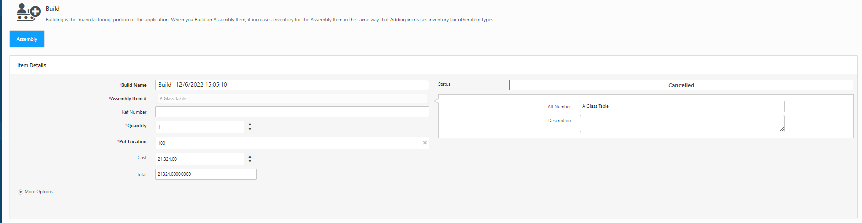 Note: The application allows Partial Build. It is not mandatory to have all the required quantities. All you need is to have enough components/BOM to build a minimum of one assembly.