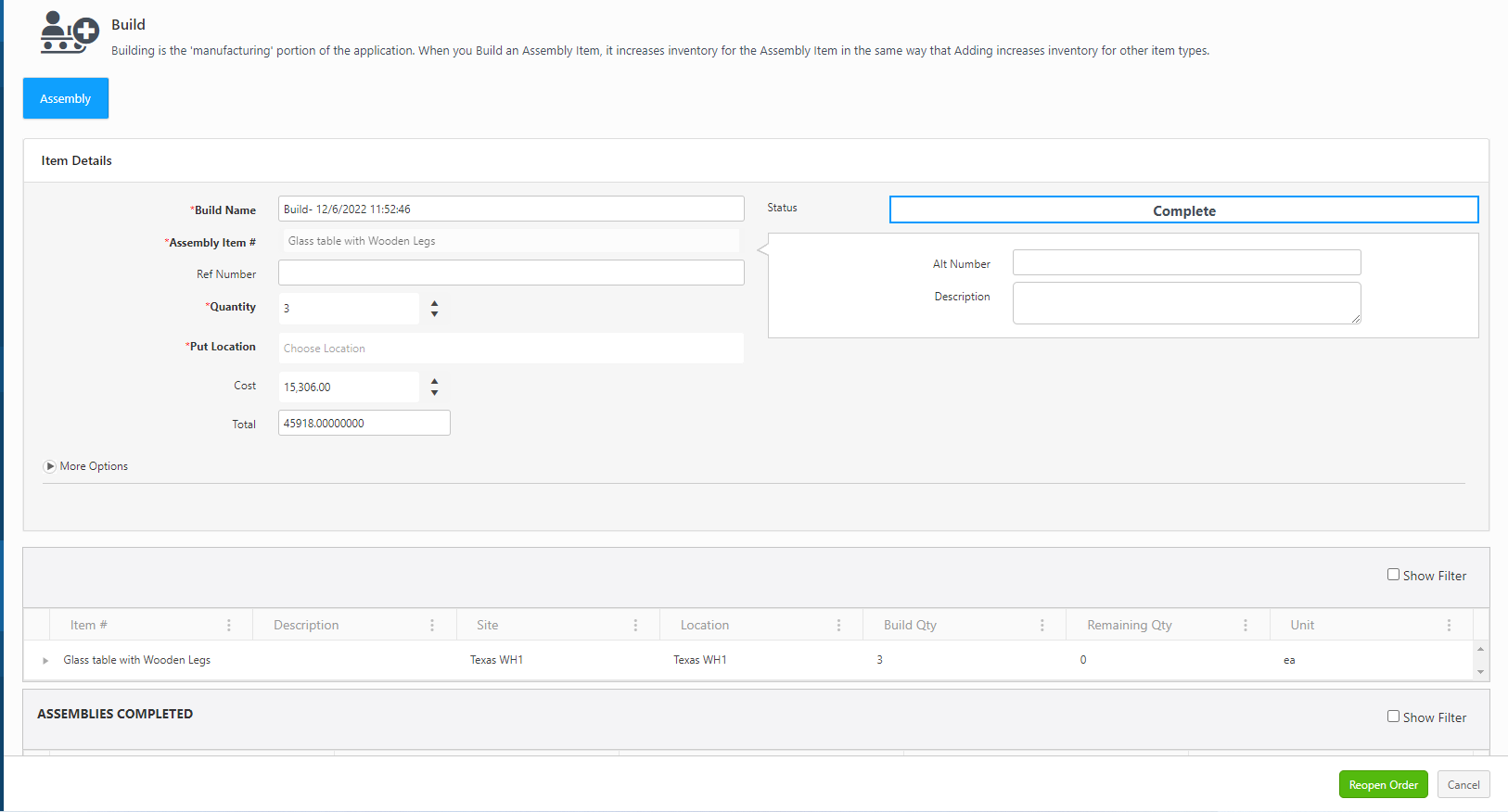 - The Reopened Order will display the Assemblies Completed information in the Assembly tab. The status will show "Reopen."