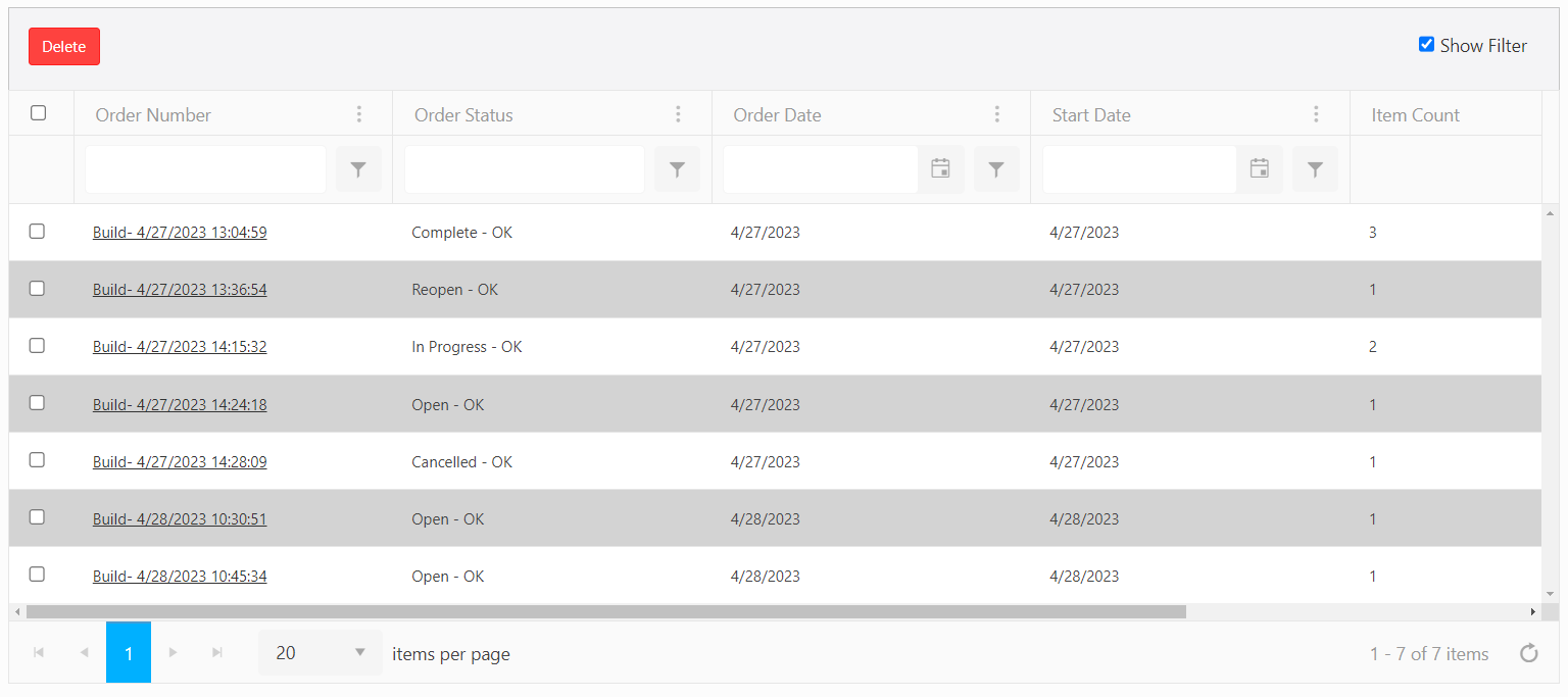 - Draft - OK - Note: The Draft status appears when you access the build order screen to create a new order. Once you save it. The status updates to “Open” on the Build screen and "Open-Ok" on the View Build Order screen.