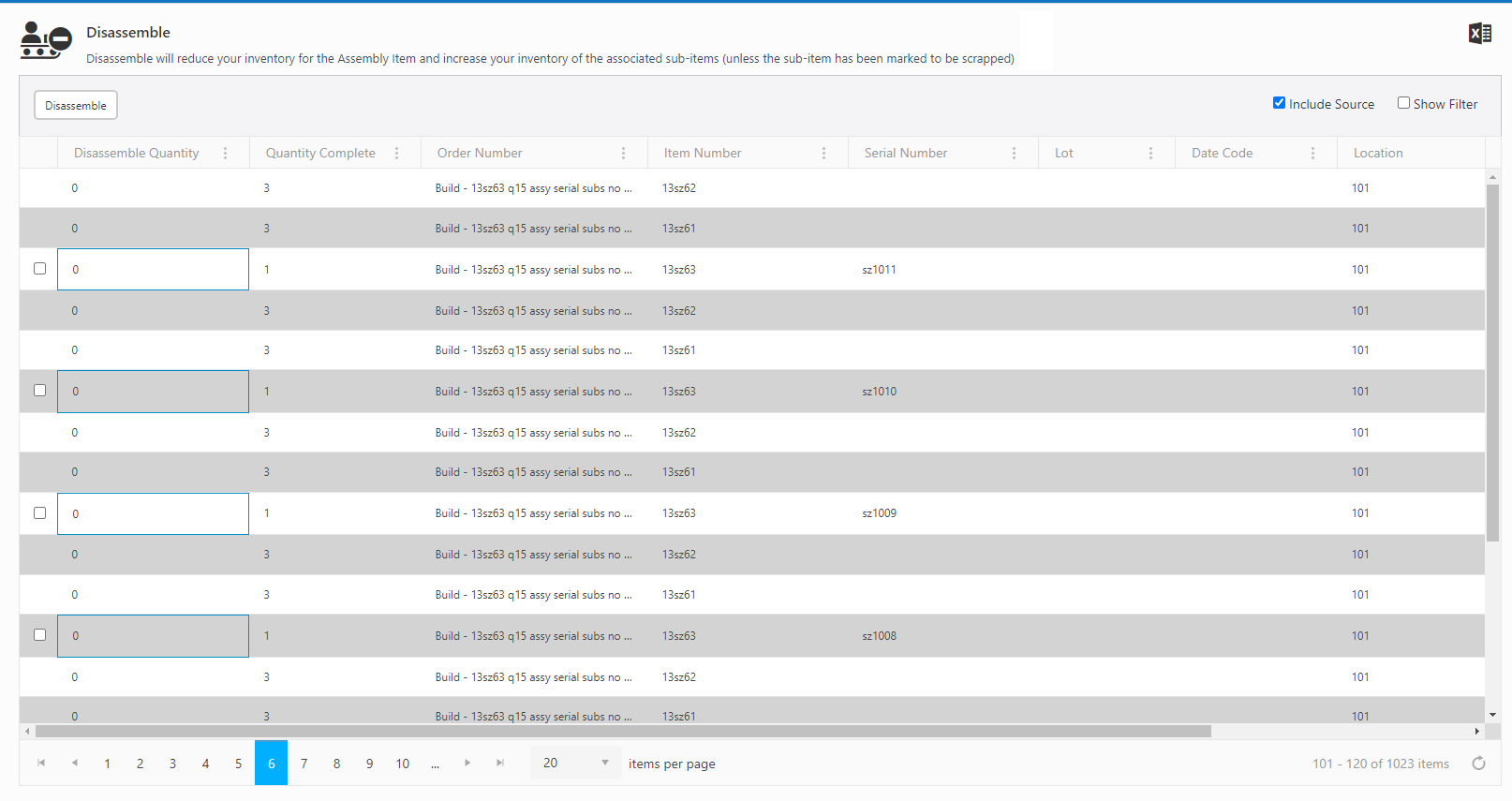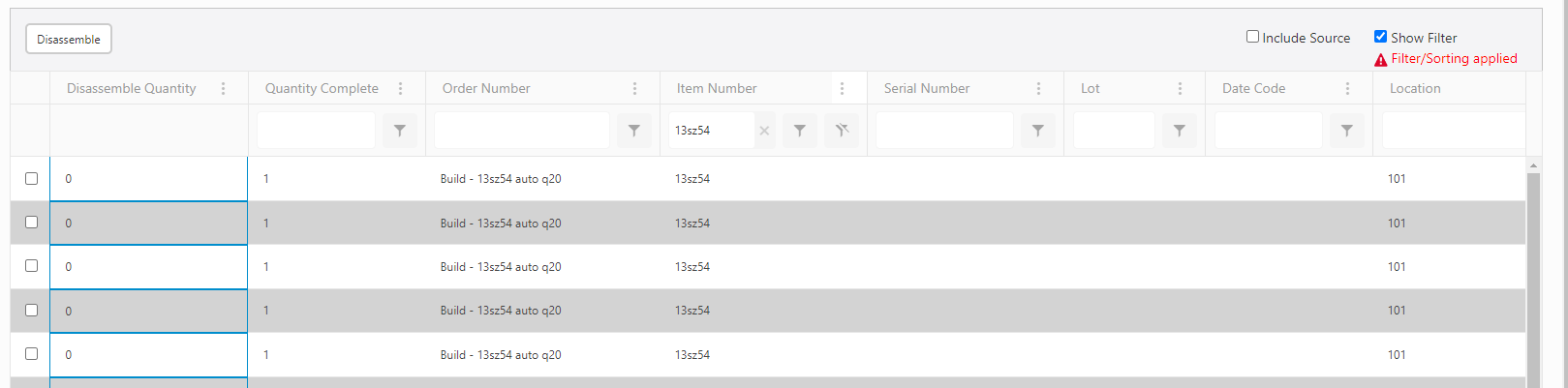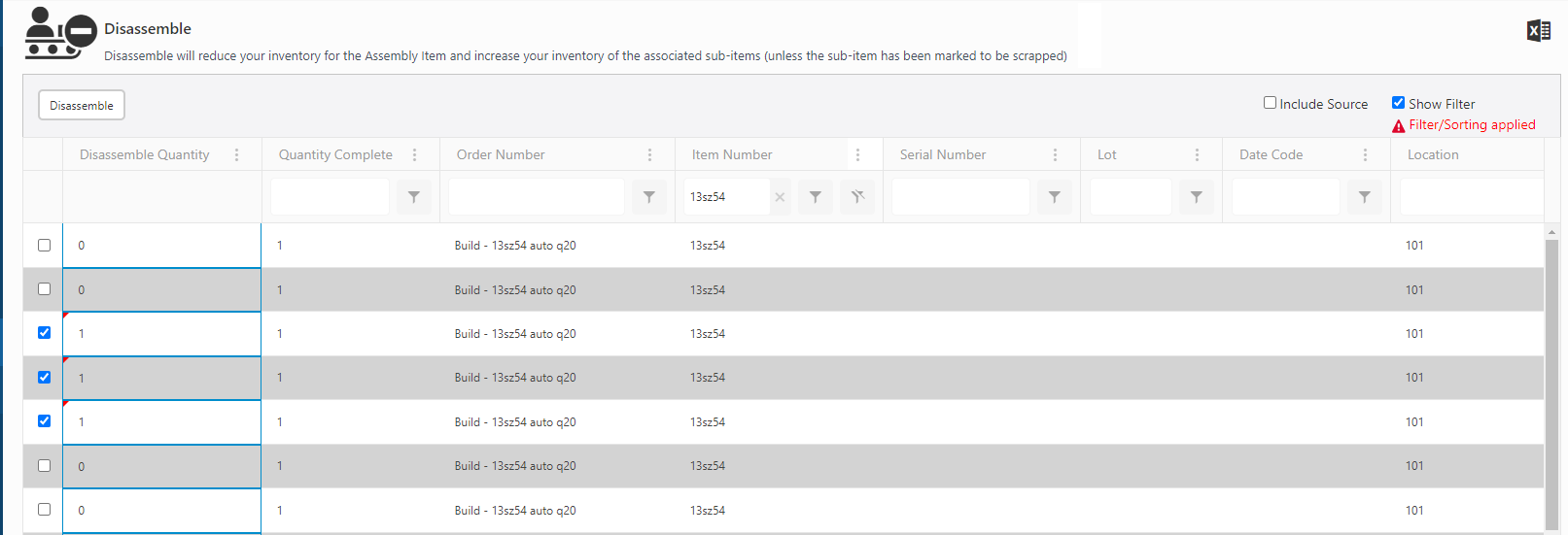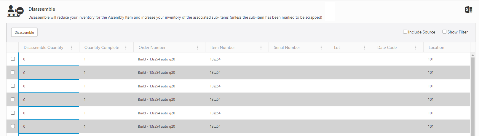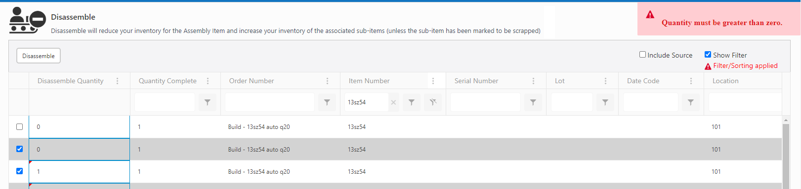 Note: A message "Quantity must be greater than zero" appears if you try to disassemble an assembly with quantity zero.