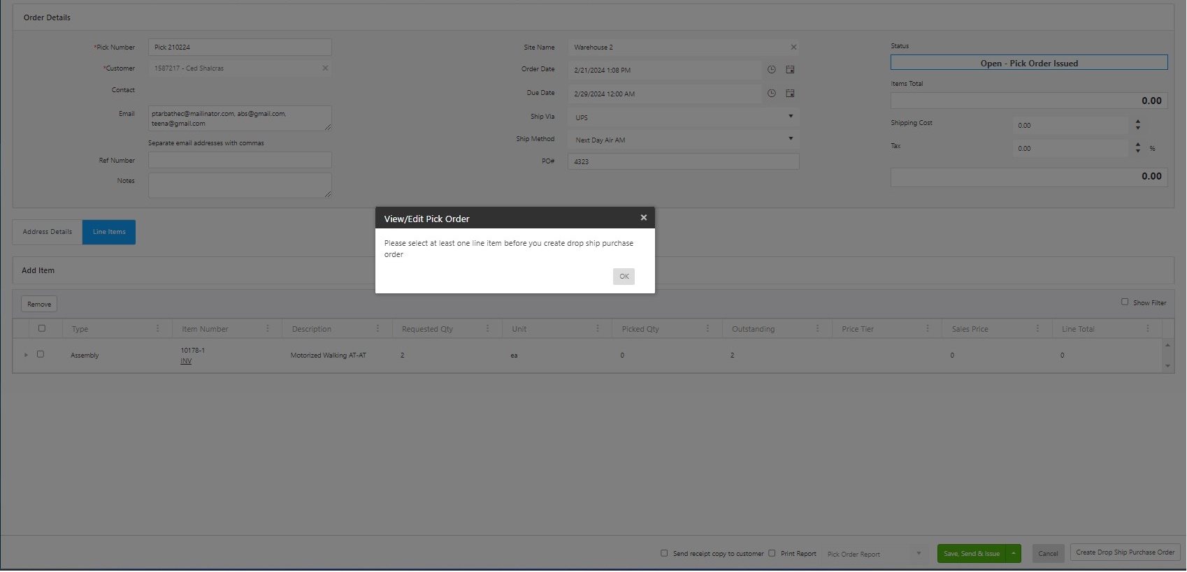 Note: Keep in mind that the order cannot be edited after selecting Save, Send and Issued. If you want to edit the order later, select the Save as Draft option by clicking on the dropdown next to the Save, Send and Issue button. Draft orders can be accessed from the View Pick Orders screen.