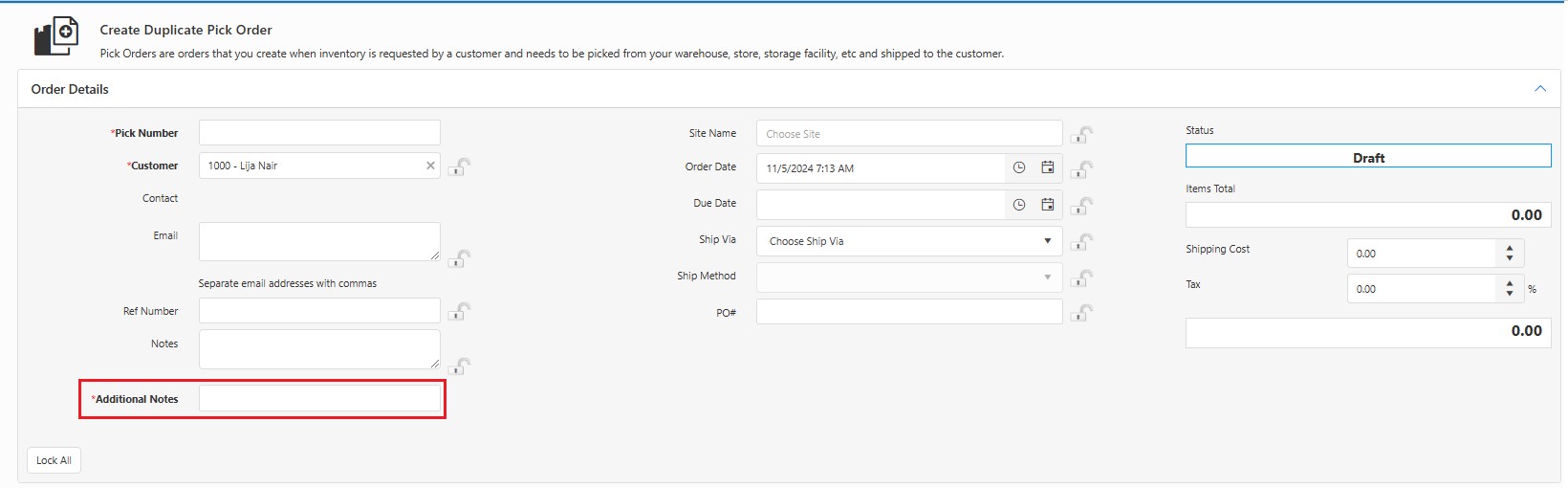 Note: Several fields in this section can be "locked". When a field is locked, it will retain the information you entered through subsequent transactions. This is useful if you are adding multiple Items to a location or checking out multiple Items to a single customer. To lock an individual field, click on the lock icon. You can select the Lock All button to quickly lock all fields that have the icon. Select Unlock All to unlock the fields, allowing you to add new information. Refer to Locking Fields.