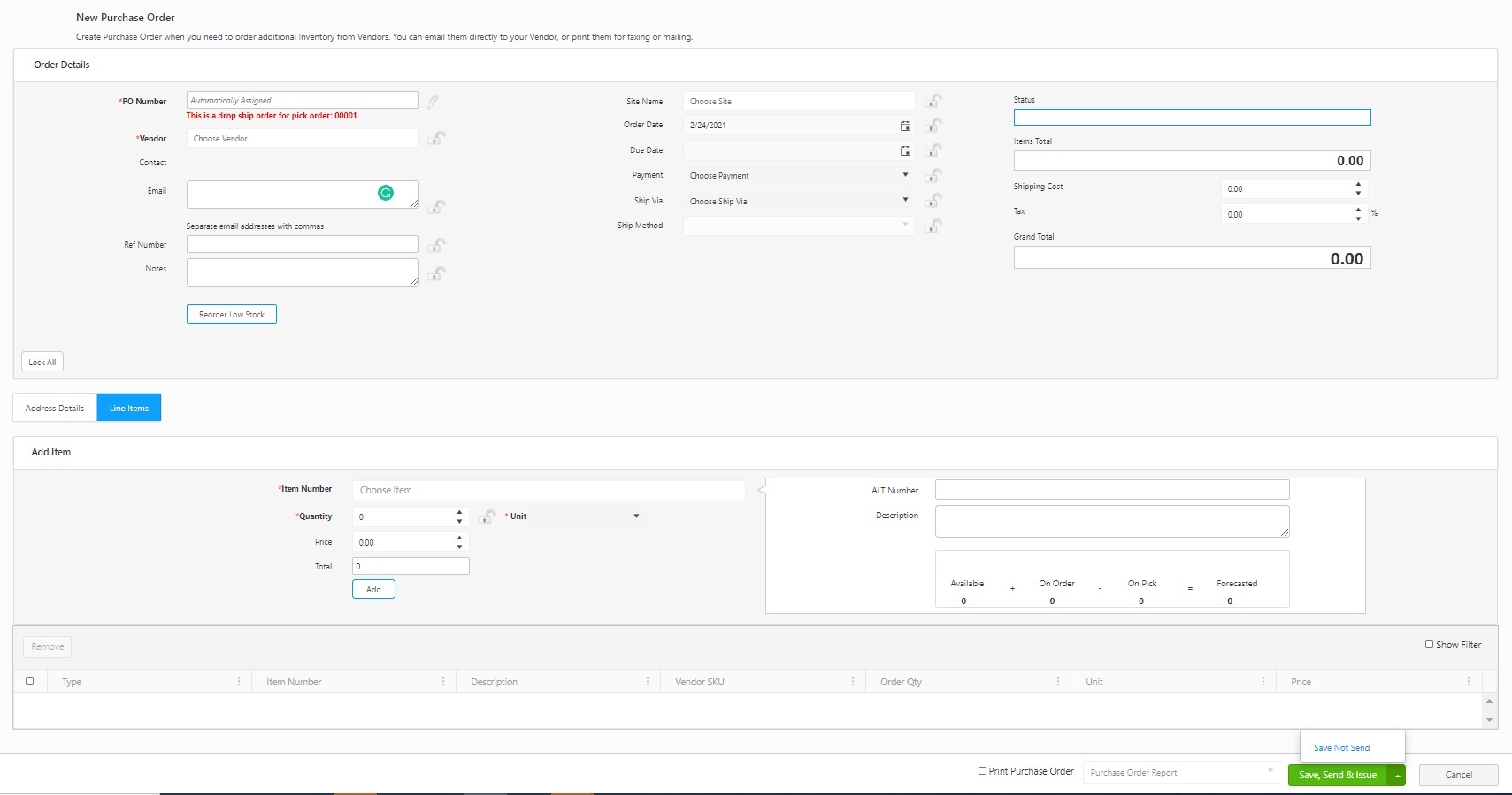 - Items Total - This field provides a total for all items added to this PO (items are added on the Line Items tab.).