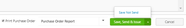 - Click Save, Send and Issue button when you are ready to complete the purchase order. The order will be sent to the email indicated on the purchase order. You can also click the Save not Send button if you do not want to send the purchase order and only want to save the details. The Save not Send button will appear when you click on the drop-down button next to the Save, Send and Issue button.