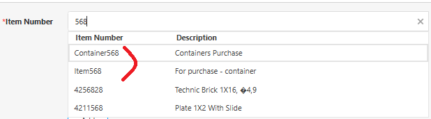 - Item Number (required) - Enter the item number you want to add to this purchase order. You can select an item or a container.