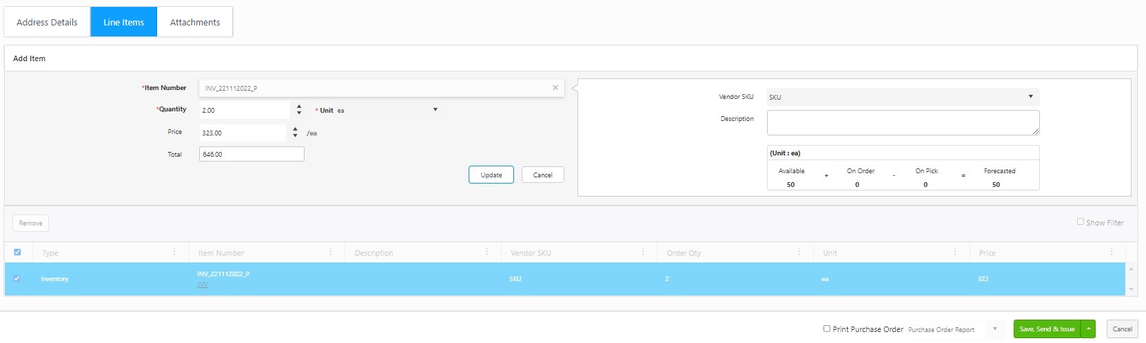 - Available/On Order/On Pick/Forecasted - These fields reflect quantity levels for the selected item. Note: Forecasted = Available + On Order - On Pick.