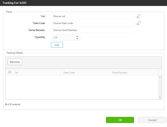 InventoryCloud allows you to specify up to three required tracking fields - Lot, Date Code, and Serial Number. The Quantity field will appear on all the Track-By's screens. It is a default field and is mandatory too.