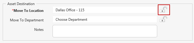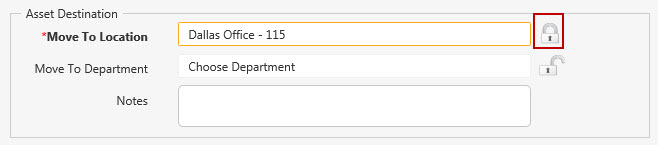Several screens in InventoryCloud allow you to "lock" fields after entering in data. This can speed up the data entry process by eliminating the need to enter the same information many times. For example, if you are moving multiple items to a site/location, you can lock the site and location fields so that you do not have to enter this information for each transaction.
