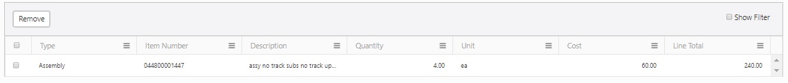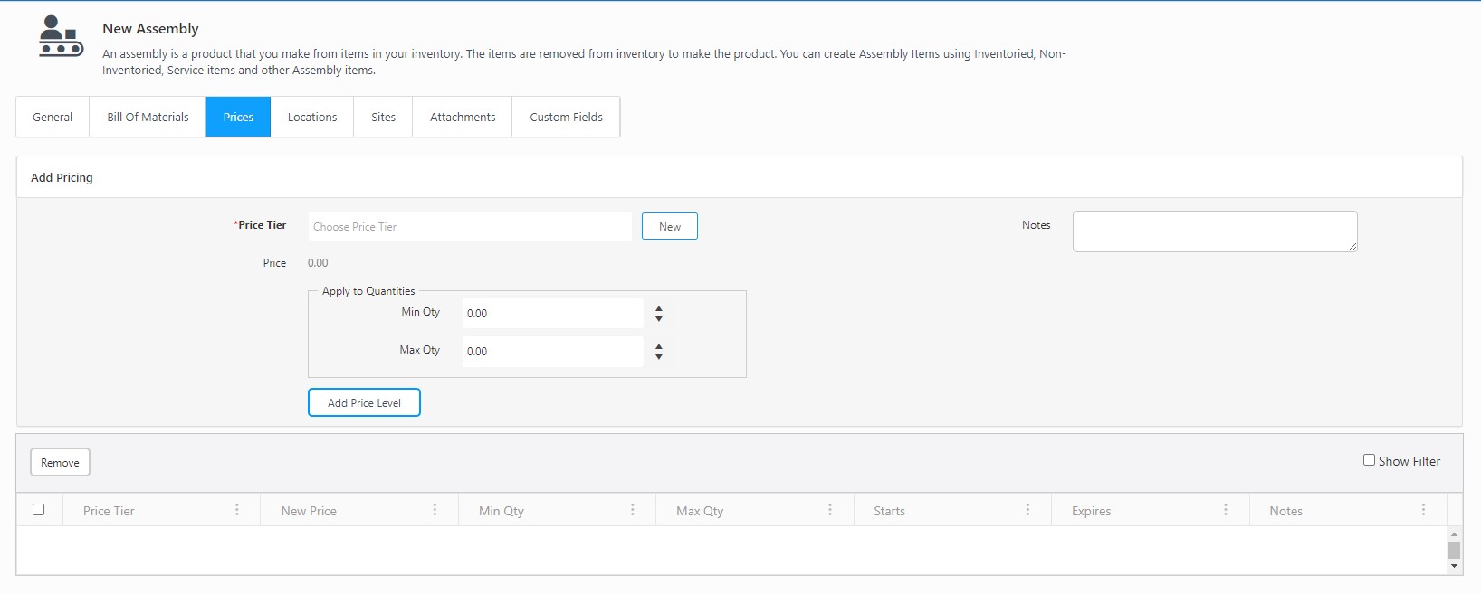 - Click the Add Price Level button to add the selected price level to the Assembly. The Price Tier will be added to the list at the bottom of the screen. To remove, select the price tier by clicking on the checkbox next to it and then click on the Remove button.