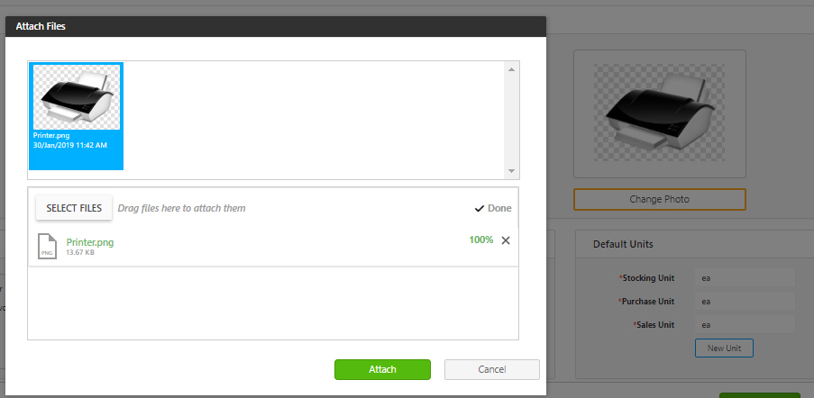 - Click on the Attach button. The photo will appear in the photo section. Click on the Change Photo to access the Attach Files screen and to select a different photo.