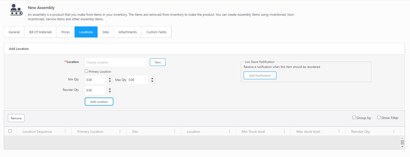 - Add Notification - This is used to create an assembly low-stock notification for a location. If you want to receive a "Low Stock Item" alert, click on Add Notification button and configure the notification.