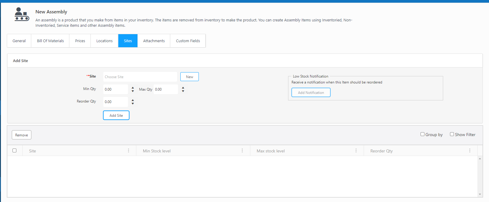 - Add Notification - This is used to create an assembly low-stock notification for a site. If you want to receive a "Low Stock Item" alert, click on Add Notification button and configure the notification.