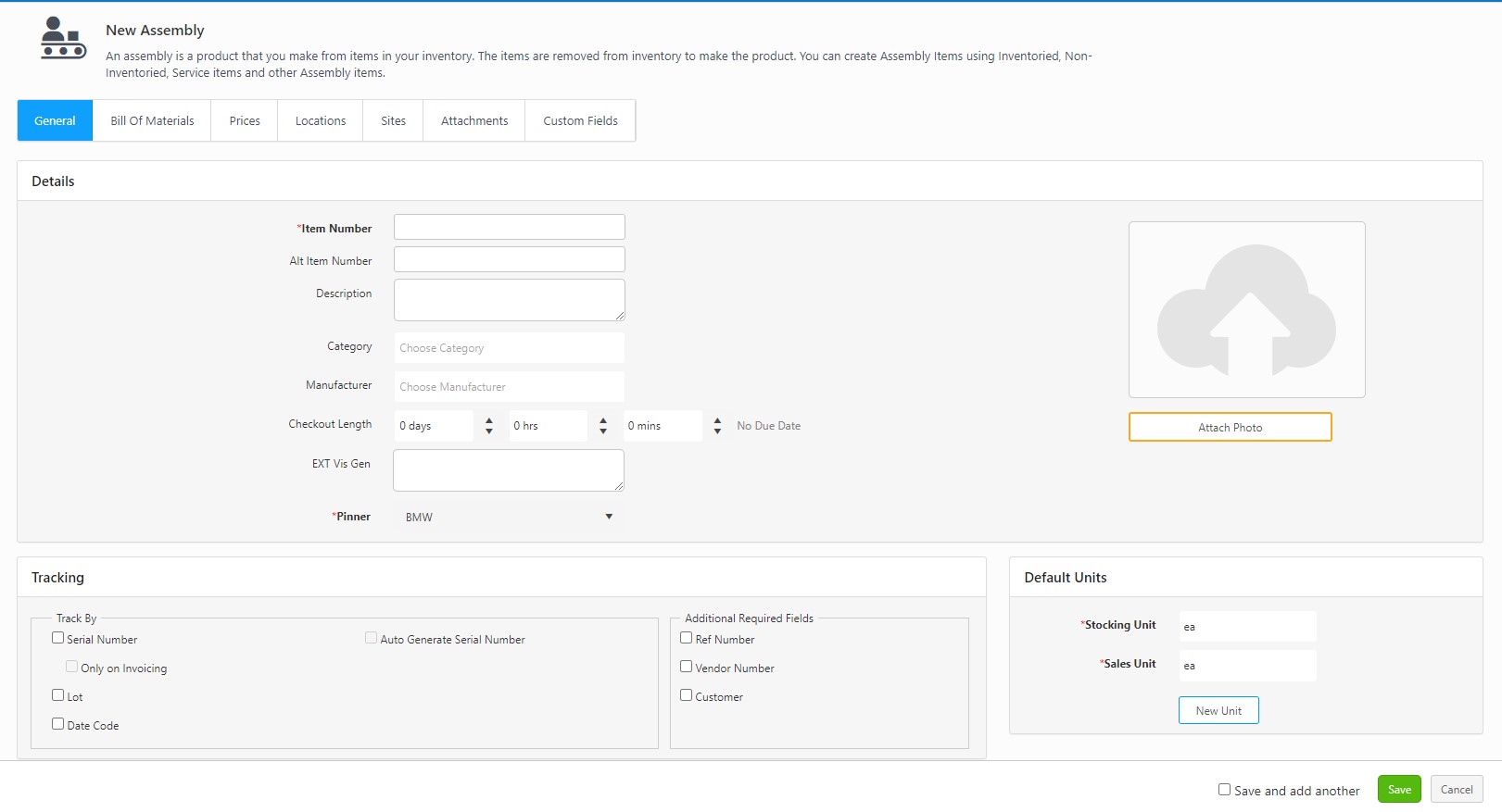 Refer to Adding a New Assembly - General Tab, Prices Tab, Locations Tab, Sites Tab, and Attachments Tab for more details.