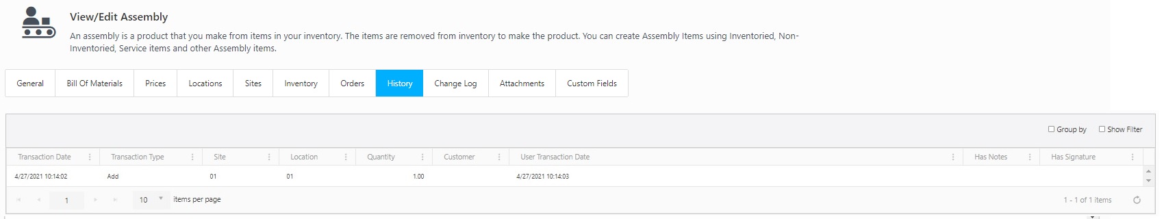 The History tab will display all the transactions related to the assembly item. It will display the Transaction Date, Transaction Type, Site, Location, Quantity, Customer, User Transaction Date, Has Notes, and Has Signature.