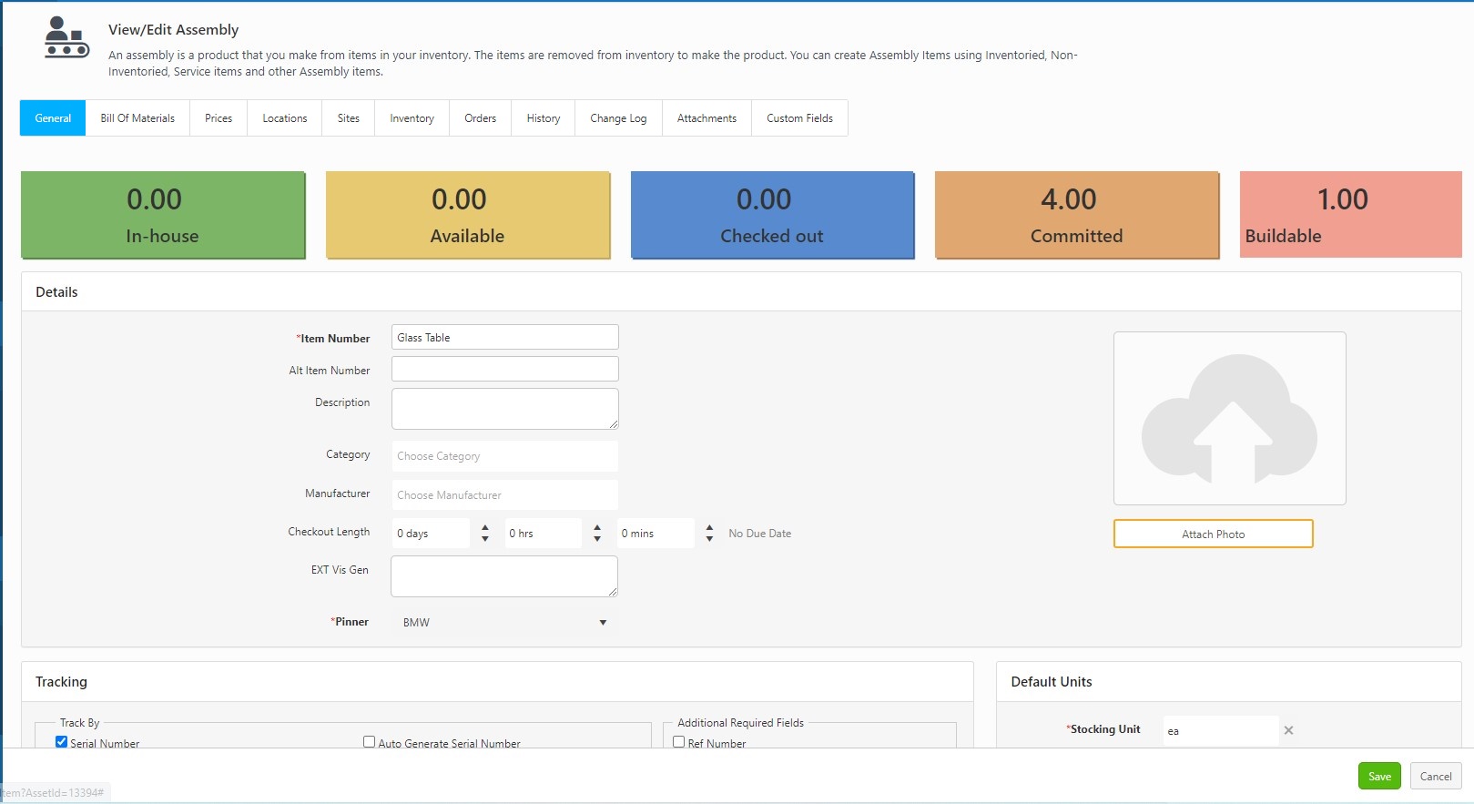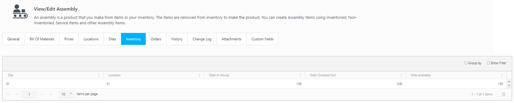 The Inventory tab will display the assembly's Site, Location, Total In House, Total Checked Out, and Total Available details.