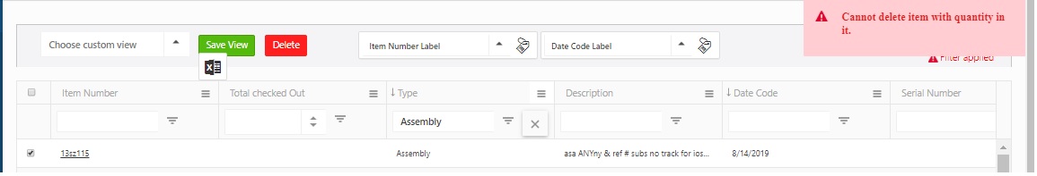 Note: You cannot delete an item that has a quantity or part of a Kit or a Bill of Material. A message "All Items could not be deleted" will appear on deleting.