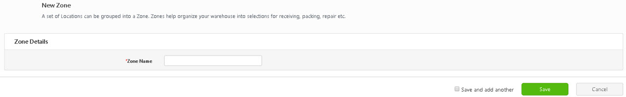 A set of locations can be grouped into a zone. A zone helps organize your warehouse into different sections, like receiving, packing, repair, etc. The New Zone screen will allow you to add new zones.