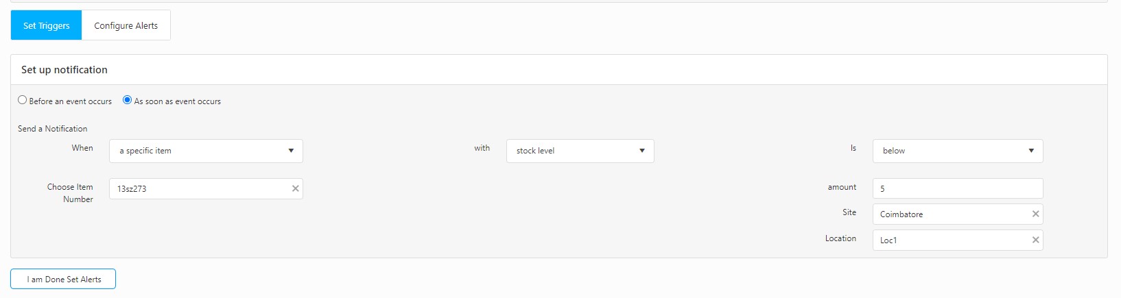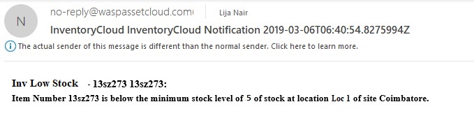 - During the Add / Remove / Adjust / Move transactions, if the quantity of the selected Item in a specific site/location is below the specified amount (amount entered in the Set Trigger screen example 300, refer to image above). The application will send an email to the provided email ID, and the notification will be triggered in the application.