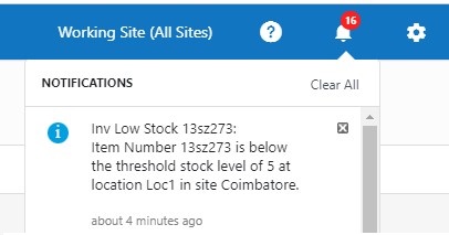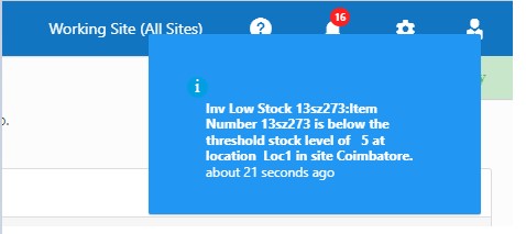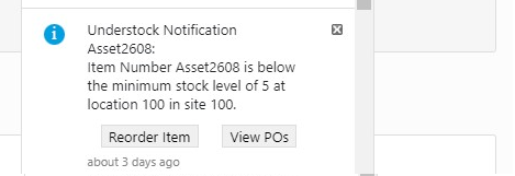 - Similarly, the notification icon will show "Reorder Item" and "View POs" options if the stock level is below the threshold stock level at a particular site/location.