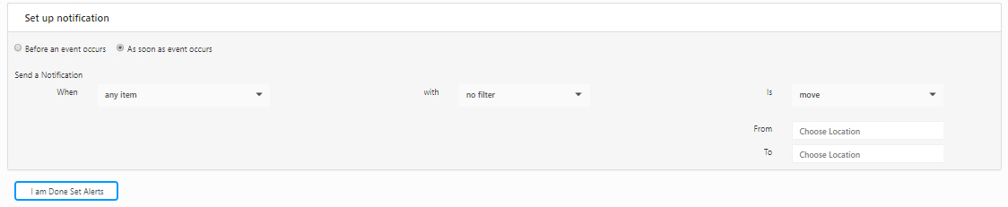 - Any Item/ A specific Item & Stock Level - The options will be below, location below min Stock Level, location over max Stock Level, site below min Stock Level, and site below max Stock Level. Note: The Stock Level notification will get triggered in the Transactions -> Move, Add, Remove, and Adjust screens.