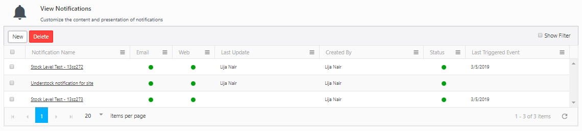 Note: Follow the same steps to create a notification for a "location below min Stock Level, location over max Stock Level, the site below min Stock Level, and site below max Stock Level".