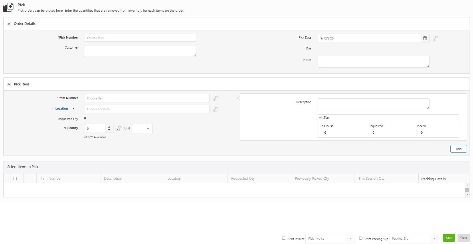 - When a pick number is selected, the items associated with that pick order will appear in the "Select Items to Pick" section, where their details can be edited or updated.