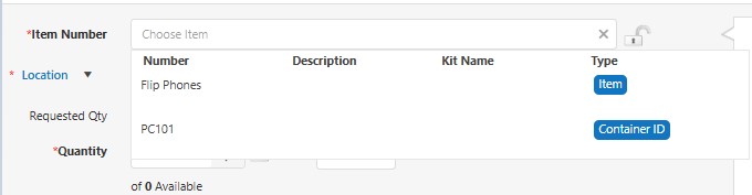 - Moving an Item in a Container to the Pick Queue & Enabling Partial Picking from Containers: Select the container ID in the Location/Container field.