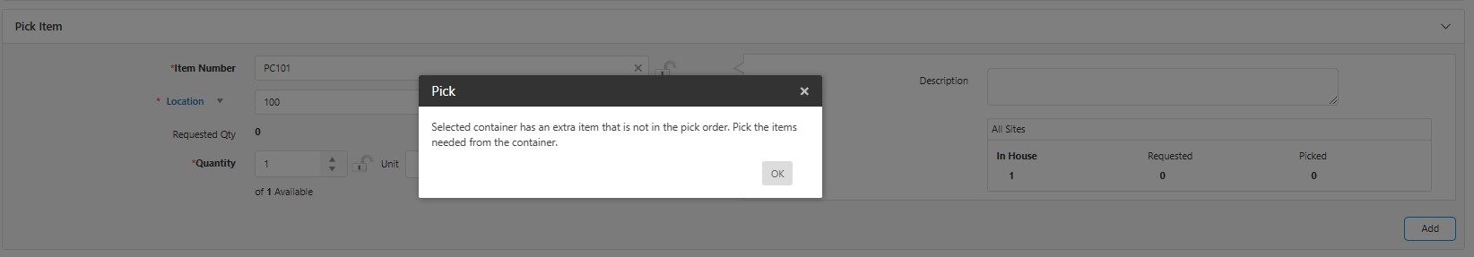- When the Container has extra Inventory: If the selected container includes items not listed in the pick order, a notification will prompt you to pick the required items before adding the container to the queue. Use the Remove Inventory feature to remove the extra items or the Move Transaction feature to transfer them to another container.
