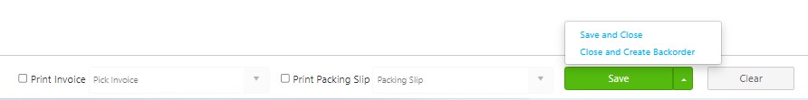 - The Pick screen allows you to Save, Save and Close or Close and Create Backorder.