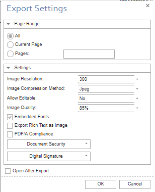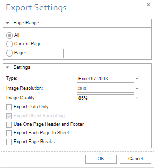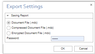 - To save the report, click on the Save button. There are five options - Document File, Adobe PDF File, Microsoft XPS File, Microsoft Excel File and Image File. When you click on one of the options, Export settings screen will appear. You can set the settings in the Export Settings screen.