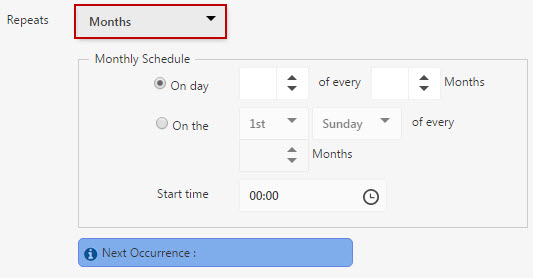 - Select the schedule at which you want to run the report. The options are Days, Weeks, and Months. Based on the selection the Schedule option will vary as shown below: