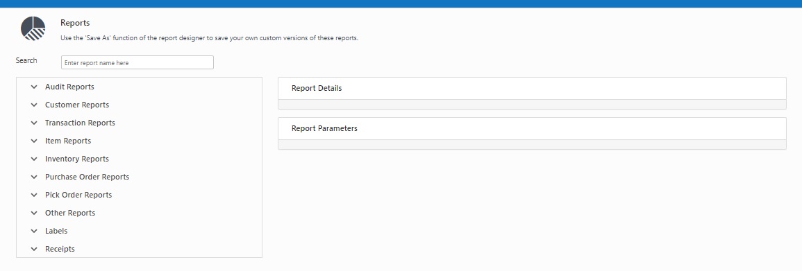 - Select the report to be generated by clicking on the drop-down button. For example, if you want to run the Item by Vendor report, click Item Reports > Item by Vendor Report. The Report Details and Report Parameters will appear.