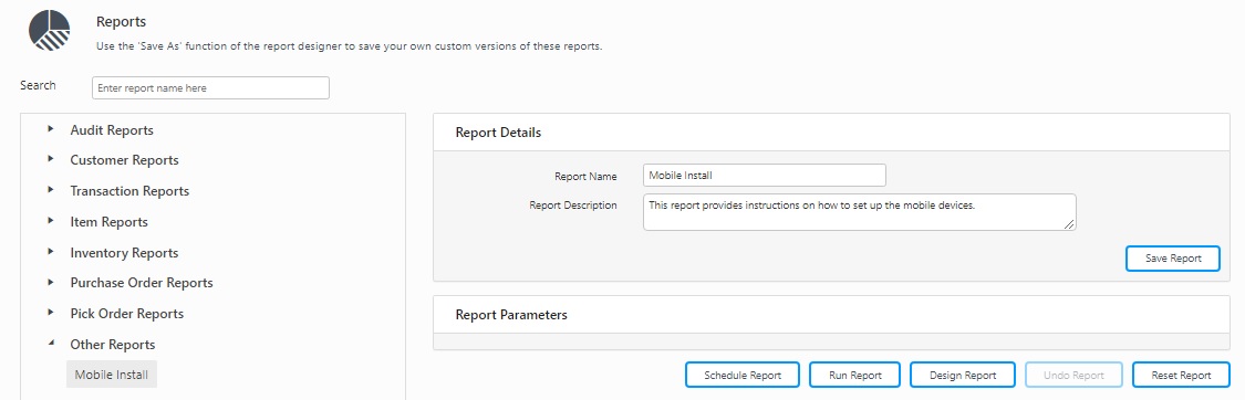 - Click on All Reports >Other Reports > Mobile Install. Click on the Design Report button.