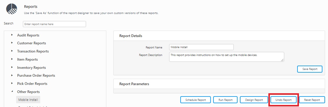 The Undo Reports button can be used to recover from report changes that did not work as expected. Every time you make a change in a report and save it. The InventoryCloud will create a backup copy of the older version of that report before saving the new report. If you see unexpected or undesired results after saving changes to a report, use the Undo function to recover the previously saved version of the report.