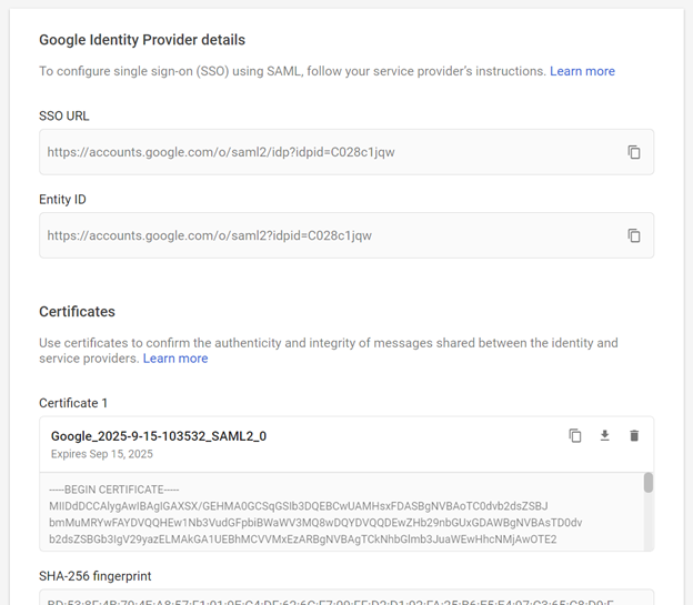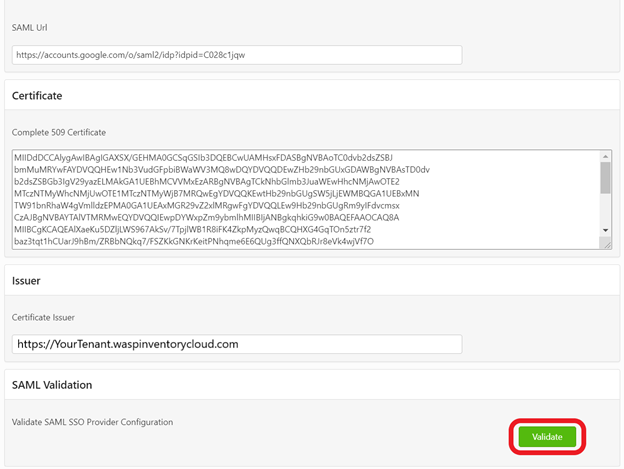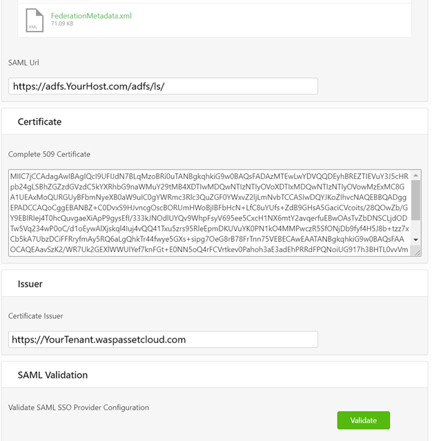 If you copied the other values, simply verify the SAML URL and Certificate with values you saved in the previous steps.