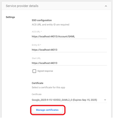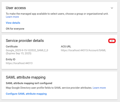 Note: If the Metadata can not be read you’ll have to enter the SAML URL and Certificate yourself. If you lost the values you can always find these values again in your google app. Select “Service Provider Details”.